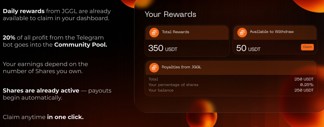 STEP 3: In your personal dashboard at Limitless, inside the “Profile”-“Your Reward” section, you’ll see a new block — “Royalties from JGGL”. It will show your percentage of shares and the amount availble to withdraw. It will clearly display how much revenue entered the Rewards Pool and where it came from.20% of all generations across the entire ecosystem are distributed among Founder Pack holders. Passive Income, Benefits Even If A Member Does Not Refer Anyone. Daily Payouts — Payouts Will Happen Every 24 Hours. The minimum withdrawal amount is $10.